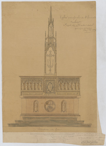 Opschrift: Eglise paroisiale de St. Léonard à L'eau. Projet du Maître Autel. Omschrijving plan: aanzicht hoofdaltaar Datum KCML: 08/12/1888 Archiefnummer: B1159