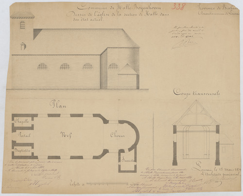 Opschrift: Commune de Halle-Boyenhoven. Dessin de l'église de la section de Halle, dans son état actuel. Omschrijving plan: plattegrond niveau 0, opstand zijgevel, dwarsdoorsnede Datum KCML: deze informatie wordt niet vermeld op het archiefstuk Archiefnummer: B1164