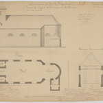 Opschrift: Commune de Halle-Boyenhoven. Dessin de l'église de la section de Halle, dans son état actuel. Omschrijving plan: plattegrond niveau 0, opstand zijgevel, dwarsdoorsnede Datum KCML: deze informatie wordt niet vermeld op het archiefstuk Archiefnummer: B1164
