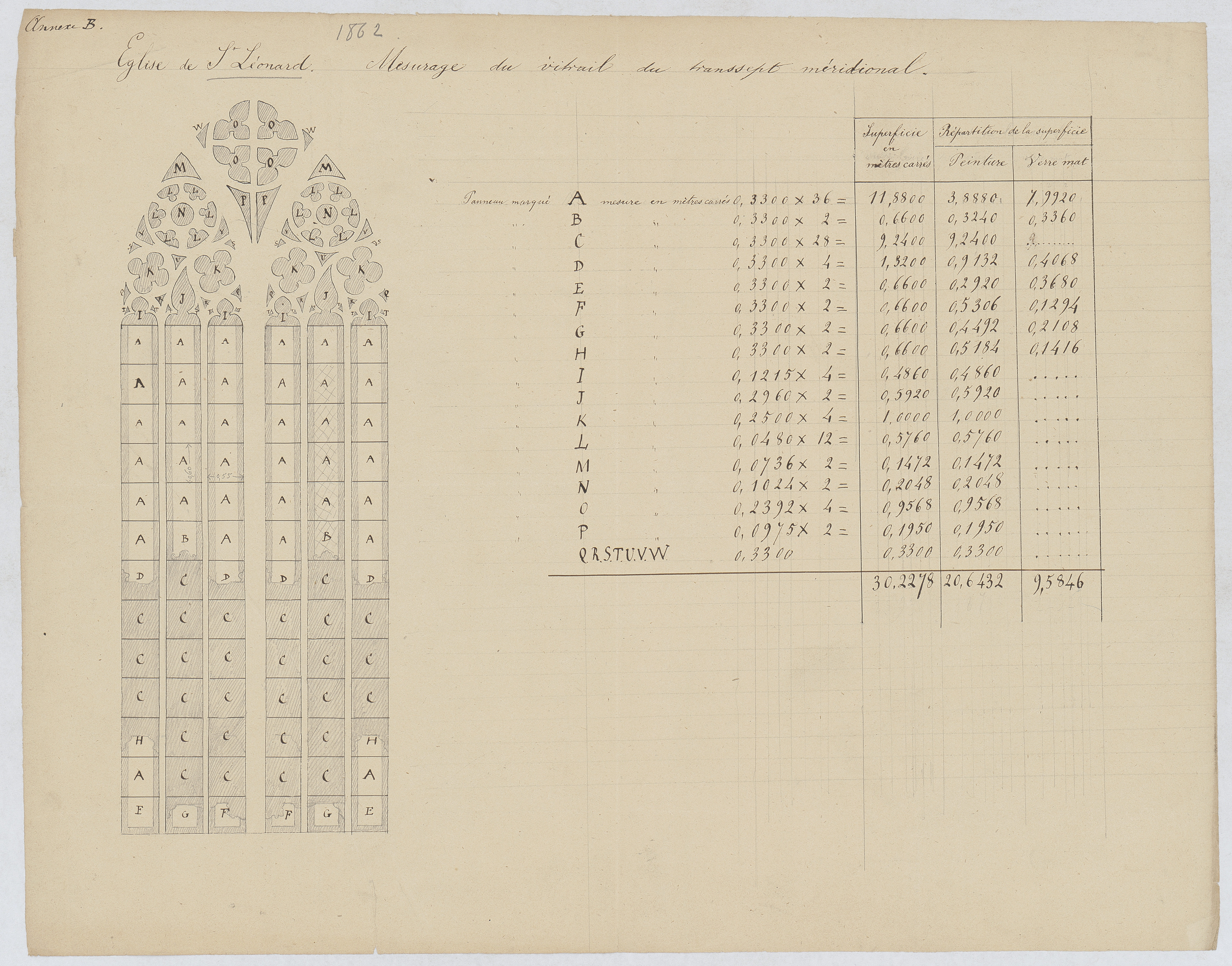 Opschrift: Eglise de St. Leonard. Mesurage du vitrail du transept méridional. Omschrijving plan: glasraam, lijst glaspanelen (afmeting en afwerking) Datum KCML: 01/01/1862 Archiefnummer: B1154