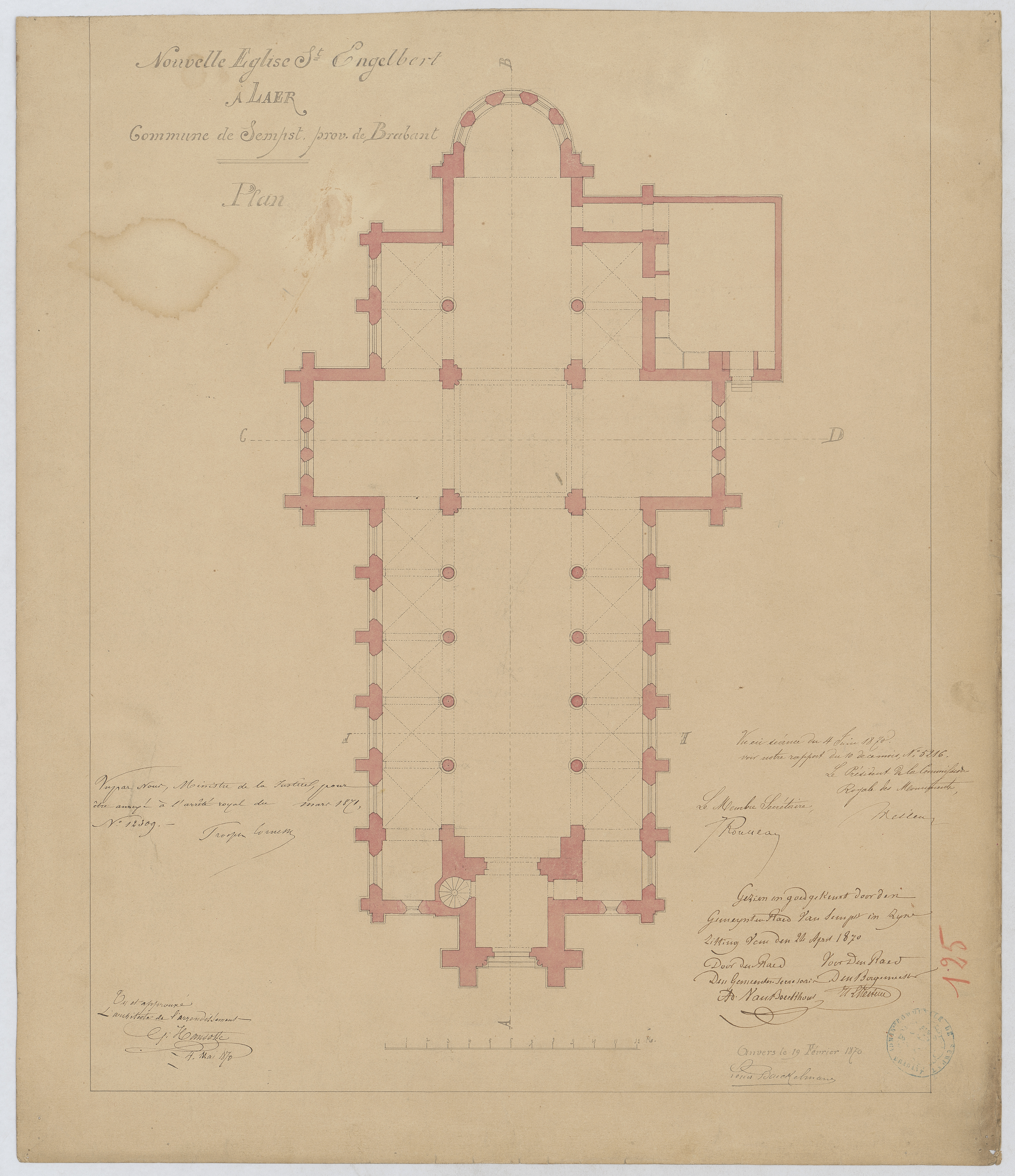 Opschrift: Nouvelle Eglise St. Engelbert à Laer. Commune de Sempst. Prov. de Brabant. Omschrijving plan: plattegrond niveau 0 Datum KCML: 04/06/1870 Archiefnummer: B1143