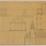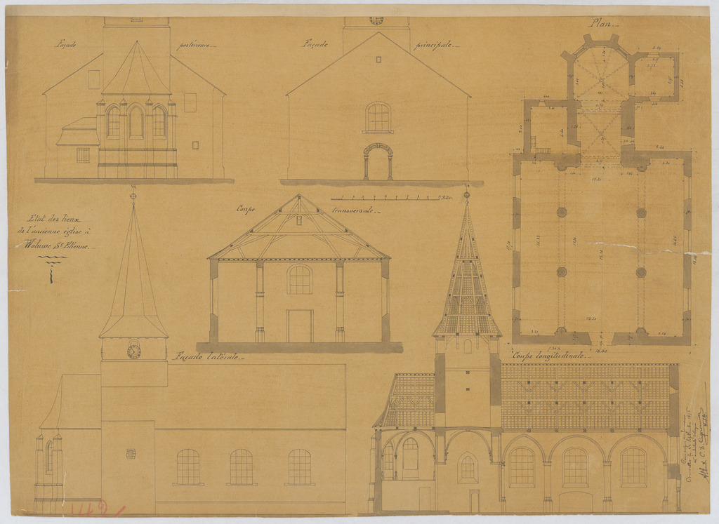 Opschrift: Etat des lieux de l'ancienne église à Woluwe St. Etienne. Omschrijving plan: plattegrond niveau 0, opstand voor-, achter- en zijgevel, langsdoorsnede, dwarsdoorsnede Datum KCML: deze informatie wordt niet vermeld op het archiefstuk Archiefnummer: B1129