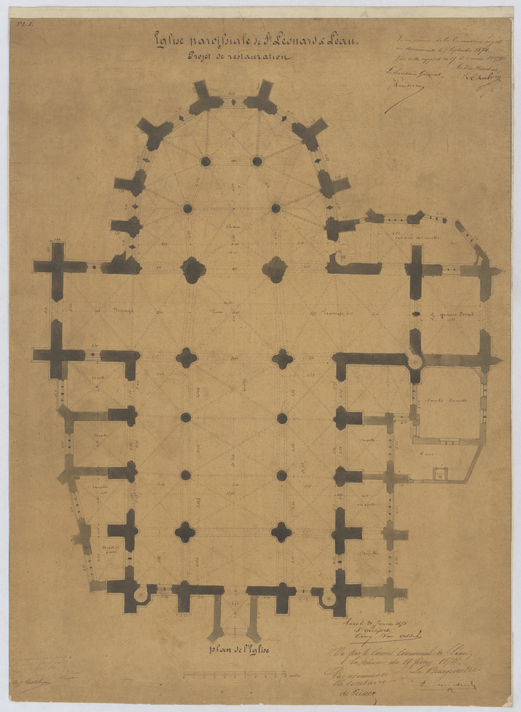 Opschrift: Eglise paroisiale de St. Léonard à l'eau. Omschrijving plan: plattegrond niveau 0 Datum KCML: 05/09/1874 Archiefnummer: B1155
