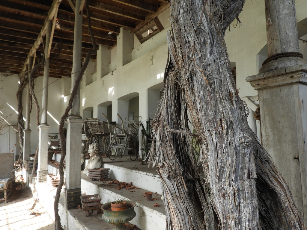 Druivenserre benedenetage met 18de-eeuwse druivelaars die door het houten plafond naar de bovenetage worden geleid