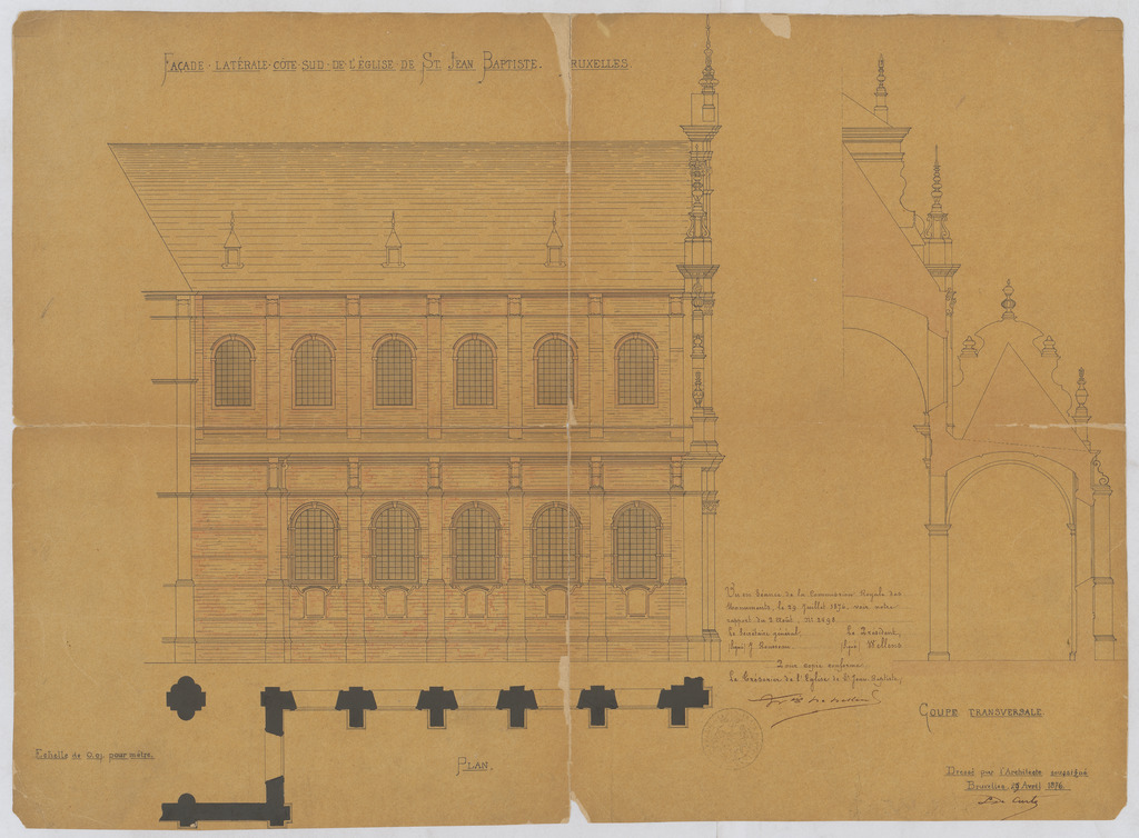 Opschrift: Façade latérale côté sud de l'église de St. Jean Baptiste Bruxelles. Omschrijving plan: opstand Z-gevel, plattegrond zijgevel, dwarsdoorsnede Datum KCML: 29/07/1876 Archiefnummer: B1243