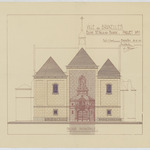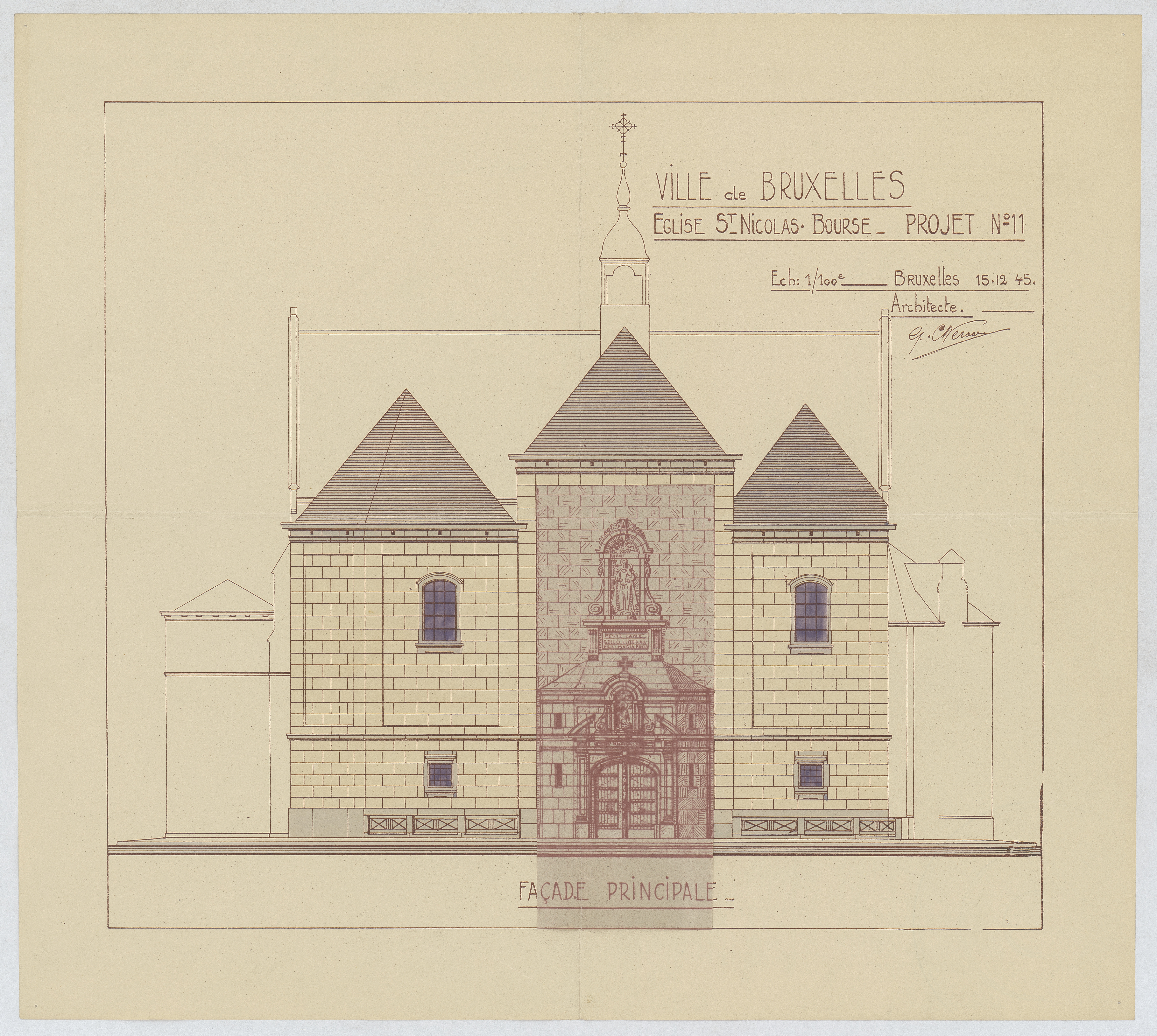 Opschrift: Ville de Bruxelles. Eglise St.-Nicolas - Bourse. Projet. Omschrijving plan: opstand voorgevel Datum KCML: deze informatie wordt niet vermeld op het archiefstuk Archiefnummer: B1281_01