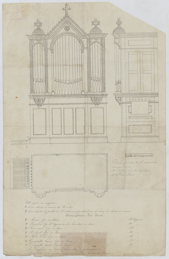 Opschrift: deze informatie wordt niet vermeld op het archiefstuk Omschrijving plan: voor-, zij- en bovenaanzicht orgel Datum KCML: deze informatie wordt niet vermeld op het archiefstuk Archiefnummer: B1240