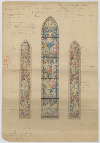 Opschrift: Eglise de la Chapelle à Bruxelles. Vitrial Nord Transept. Omschrijving plan: glasraam Datum KCML: 11/08/1883 Archiefnummer: B1224