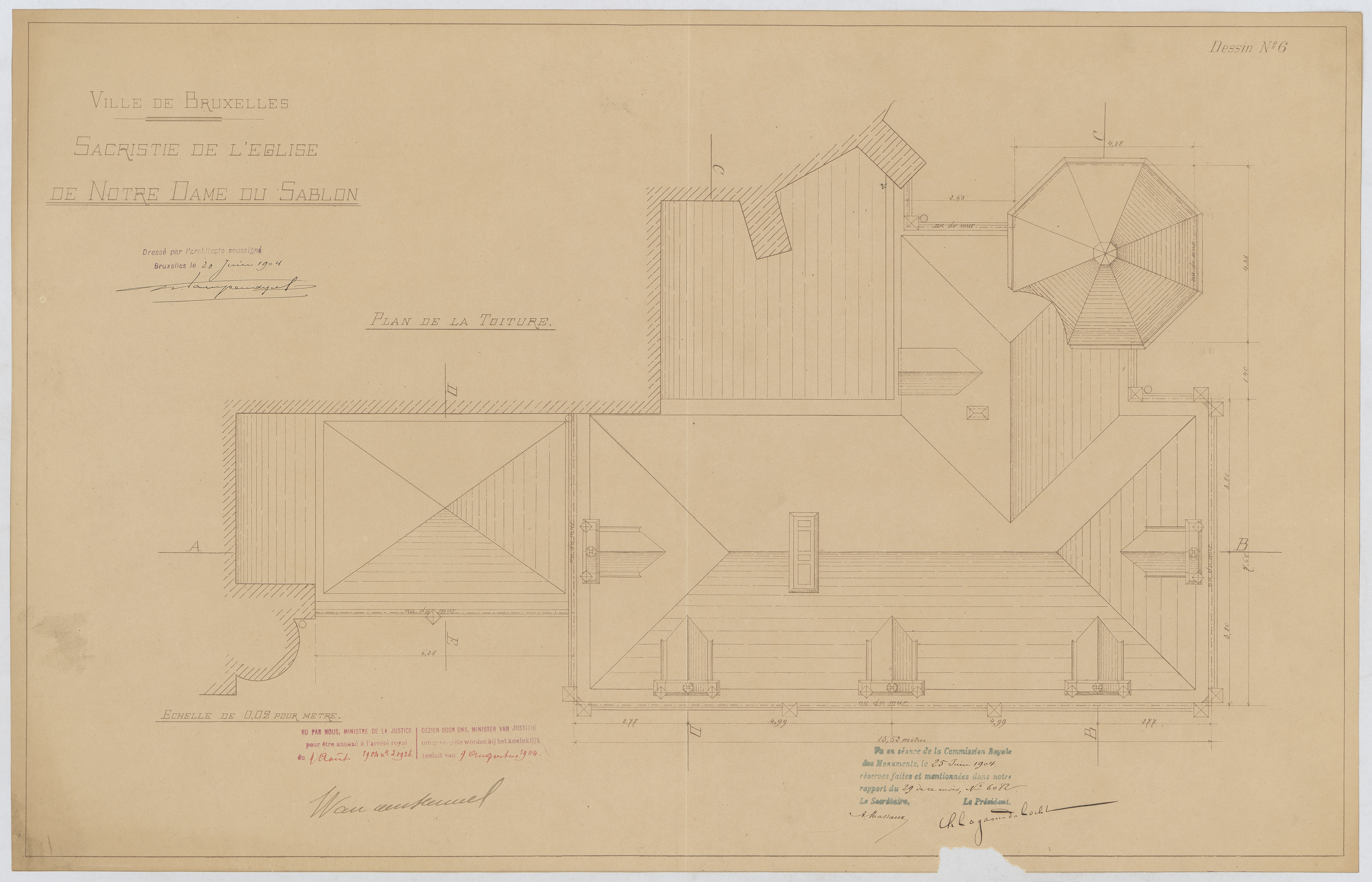Opschrift: Ville de Bruxelles. Sacristie de l'Eglise de Notre Dame du Sablon. Omschrijving plan: plattegrond niveau 2, dakenplan Datum KCML: 25/06/1904 Archiefnummer: B1203