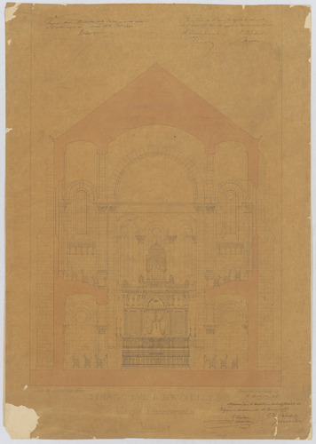 Opschrift: Synagogue de Bruxelles. Coupe transversale. Mobilier. Omschrijving plan: dwarsdoorsnede Datum KCML: 17/03/1877 Archiefnummer: B1296
