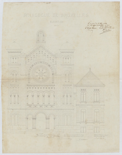 Opschrift: Synagogue de Bruxelles. Elévation. Omschrijving plan: opstand voorgevel Datum KCML: 27/06/1874 Archiefnummer: B1290