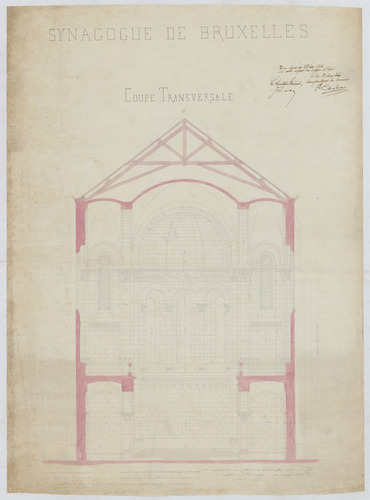 Opschrift: Synagogue de Bruxelles. Coupe transversale. Omschrijving plan: dwarsdoorsnede Datum KCML: 27/06/1874 Archiefnummer: B1292_b