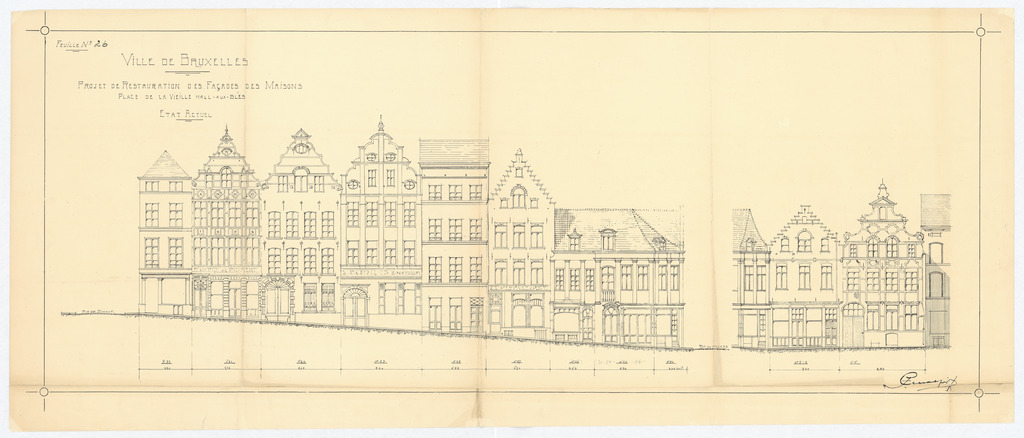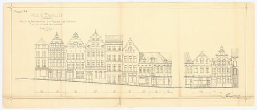 Opschrift: Ville de Bruxelles. Projet de Restauration des Façades des Maisons Place de la Veille Hall-aux-blés. Etat actuel. Omschrijving plan: opstand voorgevel Datum KCML: deze informatie wordt niet vermeld op het archiefstuk Archiefnummer: B1373