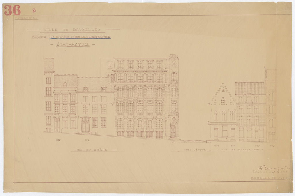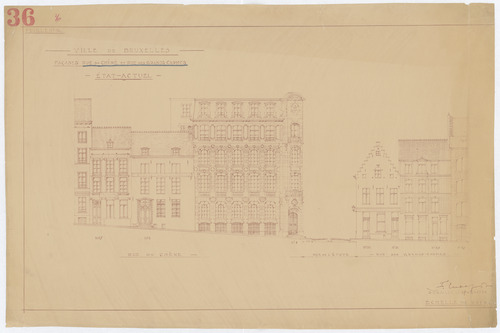 Opschrift: Ville de Bruxelles. Façades Rue du Chène et Rue des Grands-Carmes. Etat-actuel. Omschrijving plan: opstand voorgevel Datum KCML: deze informatie wordt niet vermeld op het archiefstuk Archiefnummer: B1386