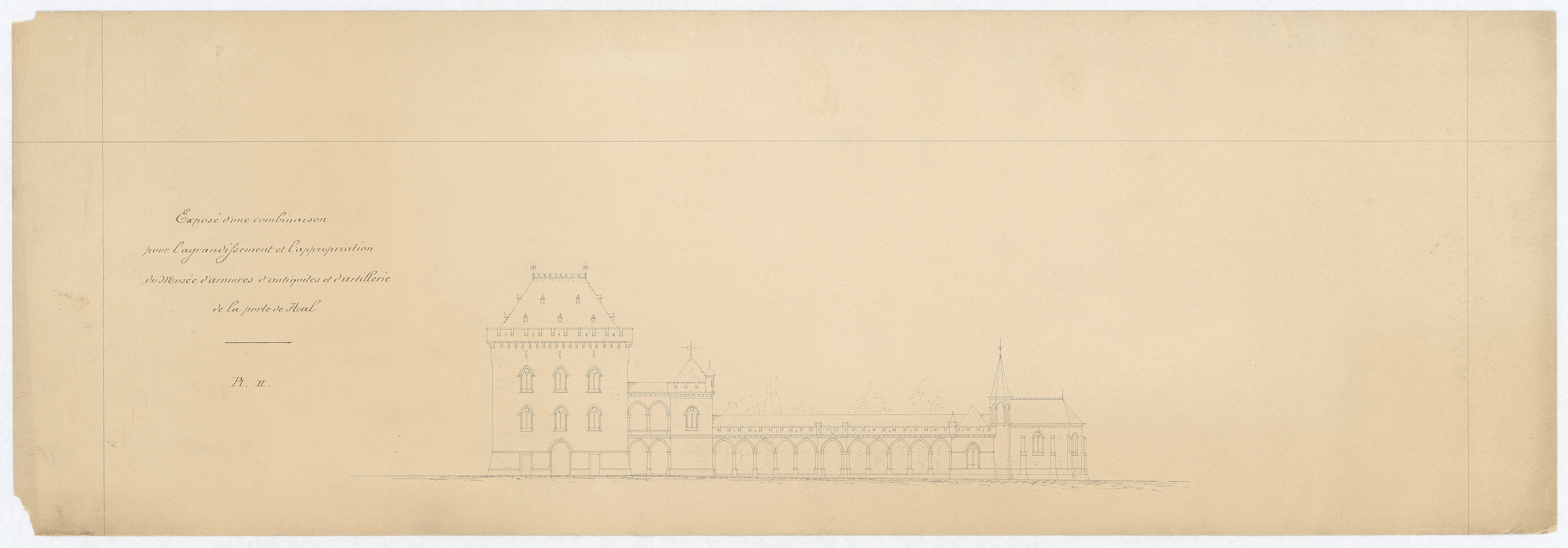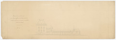 Opschrift: Exposé d'une combinaison pour l'agrandissement et l'appropriation du Musée d'armures, d'antiquités et d'artillerie de la porte de Hal. Omschrijving plan: opstand zijgevel 1 Datum KCML: deze informatie wordt niet vermeld op het archiefstuk Archiefnummer: B1422