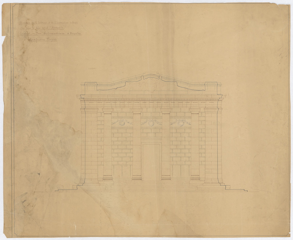 Opschrift: Ministère de l'Interieur et de l'Instruction publique. Abri pour le bas-relief "Humanité". Construit au Parc du Cinquantenaire à Bruxelles. Modification projetée. Omschrijving plan: opstand voorgevel Datum KCML: deze informatie wordt niet vermeld op het archiefstuk Archiefnummer: B1490