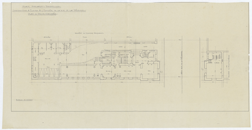 Opschrift: Place Poelaert. Bruxelles. Constructions à Elever à l'entrée de la rue de la Régence. Plan du Rez-de-Chaussée. Omschrijving plan: plattegrond niveau 0 Datum KCML: deze informatie wordt niet vermeld op het archiefstuk Archiefnummer: B1454