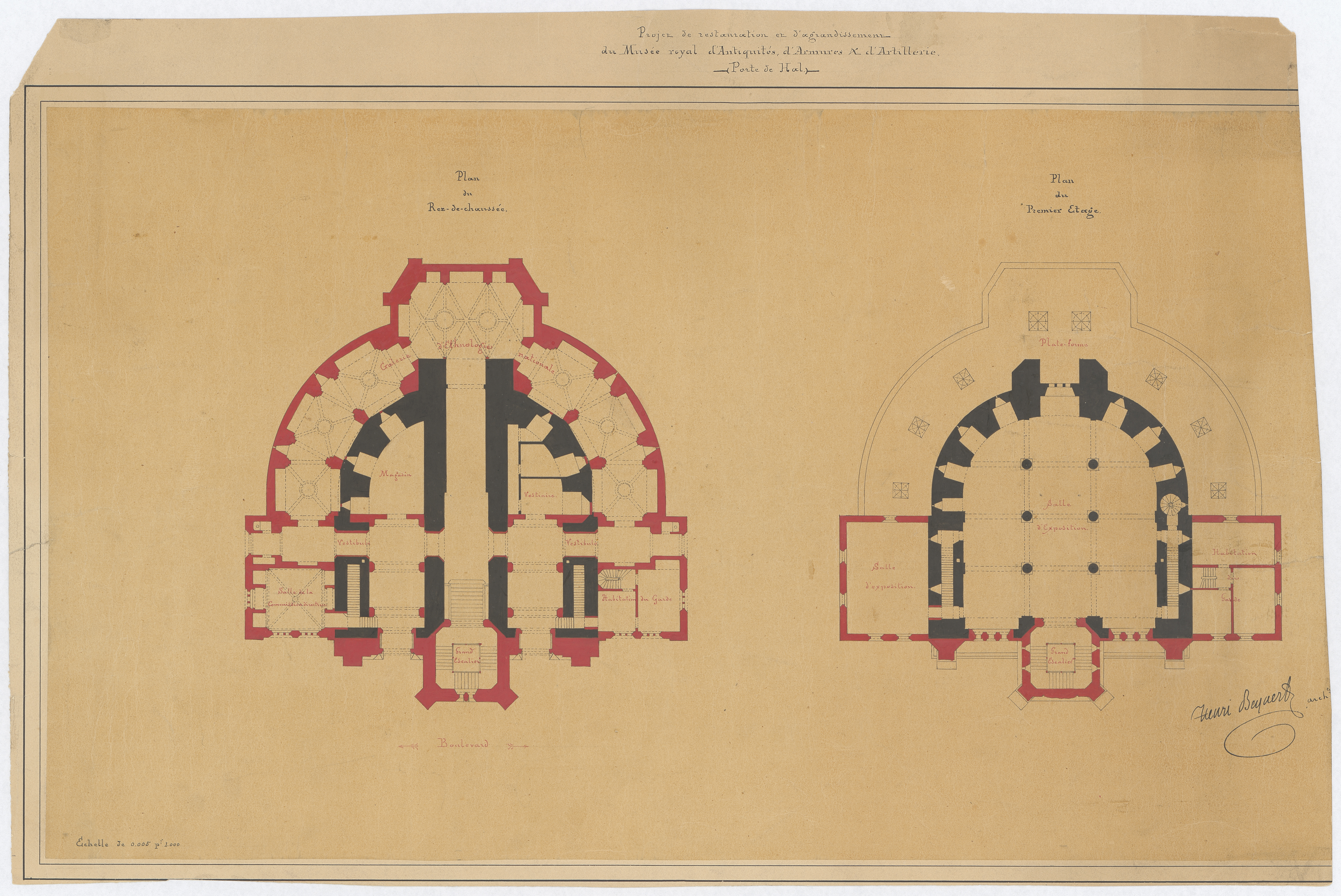 Opschrift: Projet de restauration et d'agrandissement du Musée royal d'Antiquités, d'Armures & d'Artillerie. Porte de Hal. Omschrijving plan: plattegrond niveau 0, plattegrond niveau 1 Datum KCML: deze informatie wordt niet vermeld op het archiefstuk Archiefnummer: B1418