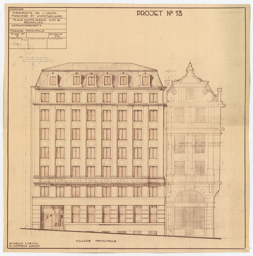 Opschrift: Propriété de l'Union Foncière et hypothecaire. Place Sainte Gudule 19 et 20 Bruxelles. Agrandissements. Façade principale. Projet n° 13. Omschrijving plan: opstand voorgevel Datum KCML: deze informatie wordt niet vermeld op het archiefstuk Archiefnummer: B1514