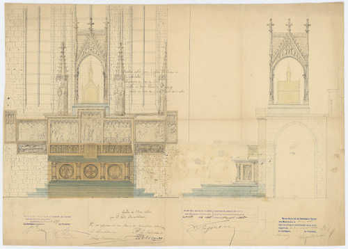 Opschrift: Maître autel pour l'Eglise St. Pierre à Anderlecht. Omschrijving plan: voor- en zijaanzicht hoofdaltaar Datum KCML: 25/06/1898 Archiefnummer: B1597