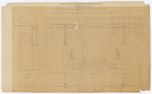 Opschrift: Hôtel de Ville de Bruxelles. Galerie vers la grande place à droite de la tour. Plan de l'aucrage ayant soutenu les Culs-de-Lamps. Omschrijving plan: opstand voorgevel/galerij, plattegrond en doorsnede galerij Datum KCML: deze informatie wordt niet vermeld op het archiefstuk Archiefnummer: B1500