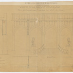Opschrift: Hôtel de Ville de Bruxelles. Galerie vers la grande place à droite de la tour. Plan de l'aucrage ayant soutenu les Culs-de-Lamps. Omschrijving plan: opstand voorgevel/galerij, plattegrond en doorsnede galerij Datum KCML: deze informatie wordt niet vermeld op het archiefstuk Archiefnummer: B1500