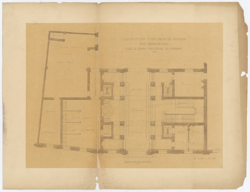 Opschrift: Construction d'une salle de séance avec dépendances pour le conseil provincial du Brabant. Omschrijving plan: plattegrond niveau 0 Datum KCML: deze informatie wordt niet vermeld op het archiefstuk Archiefnummer: B1525