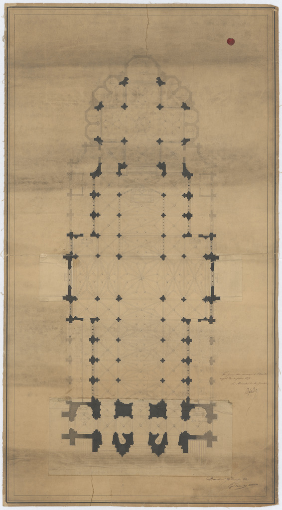 Drager: papier op doek, papier met wijzigingen aangehecht Techniek: pen, opgehoogd met aquarel Afmetingen (h x b in mm): 1134 x 613 mm Schaal: deze informatie wordt niet vermeld op het archiefstuk