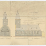 Opschrift: Province de Brabant. Commune de Neder over Heembeek. Projet de restauration de l'église. Plan et élévation. Omschrijving plan: plattegrond niveau 0, opstand voor-, achter- en zijgevels, voor- en zijaanzicht koor Datum KCML: 20/05/1922 Archiefnummer: B1588
