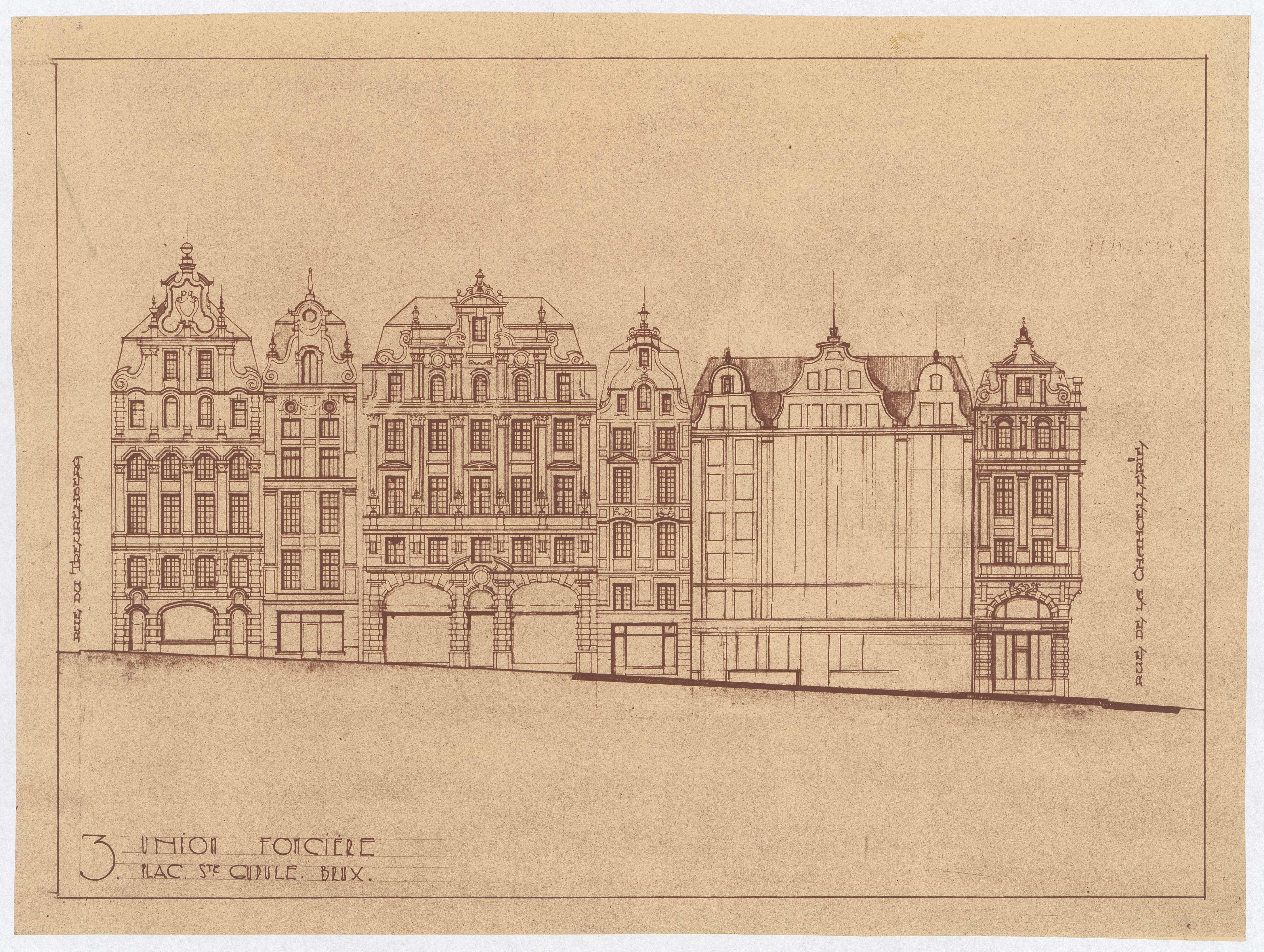 Opschrift: Union Foncière. Pl. Ste. Gudule Brux. Omschrijving plan: opstand voorgevel Datum KCML: deze informatie wordt niet vermeld op het archiefstuk Archiefnummer: B1520