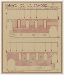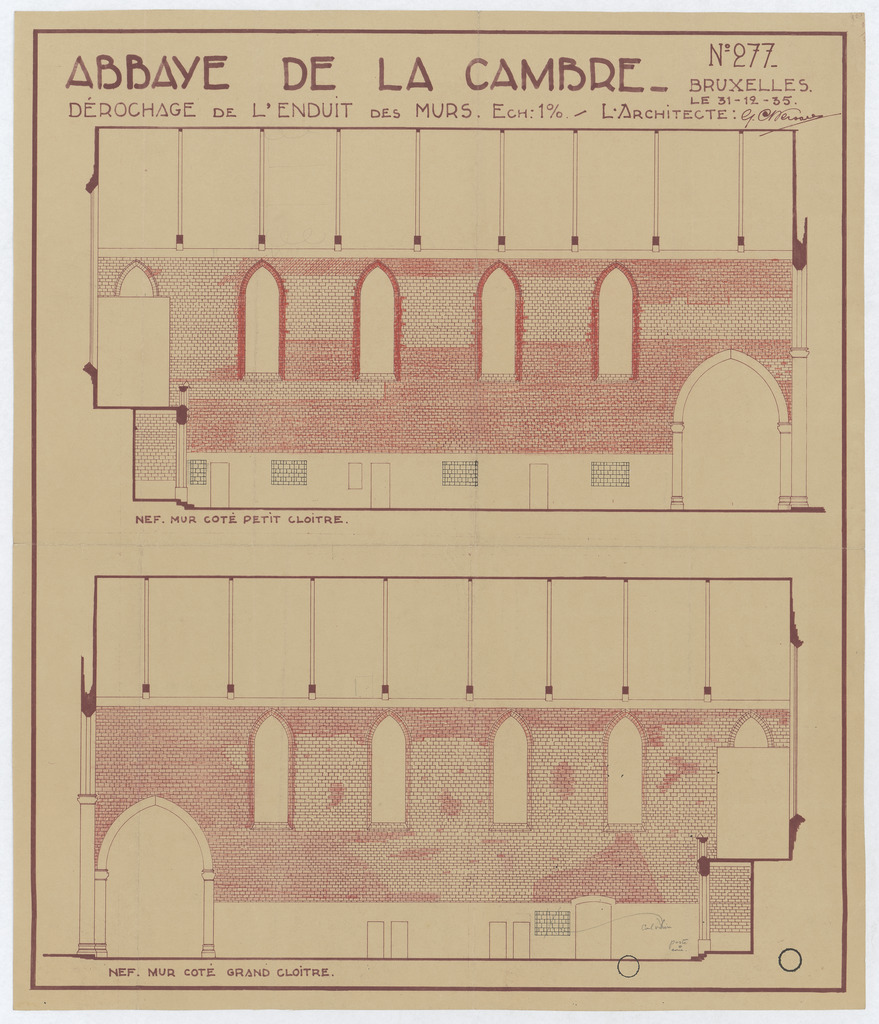 Opschrift: Abbaye de la Cambre. Dérochage de l'enduit des murs. Omschrijving plan: opstand muren schip Datum KCML: deze informatie wordt niet vermeld op het archiefstuk Archiefnummer: B1678