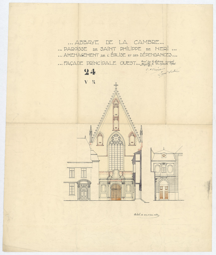 Opschrift: Abbaye de la Cambre. Paroisse de Saint Philippe de Neri. Aménagement de l'Eglise er des dépendances. Façade principale ouest. Omschrijving plan: opstand O-gevel Datum KCML: deze informatie wordt niet vermeld op het archiefstuk Archiefnummer: B1664