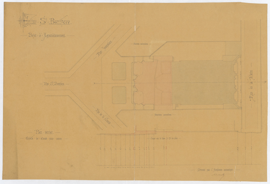 Opschrift: Eglise St. Boniface. Projet d'Agrandissement. Omschrijving plan: situatieplan Datum KCML: deze informatie wordt niet vermeld op het archiefstuk Archiefnummer: B1632
