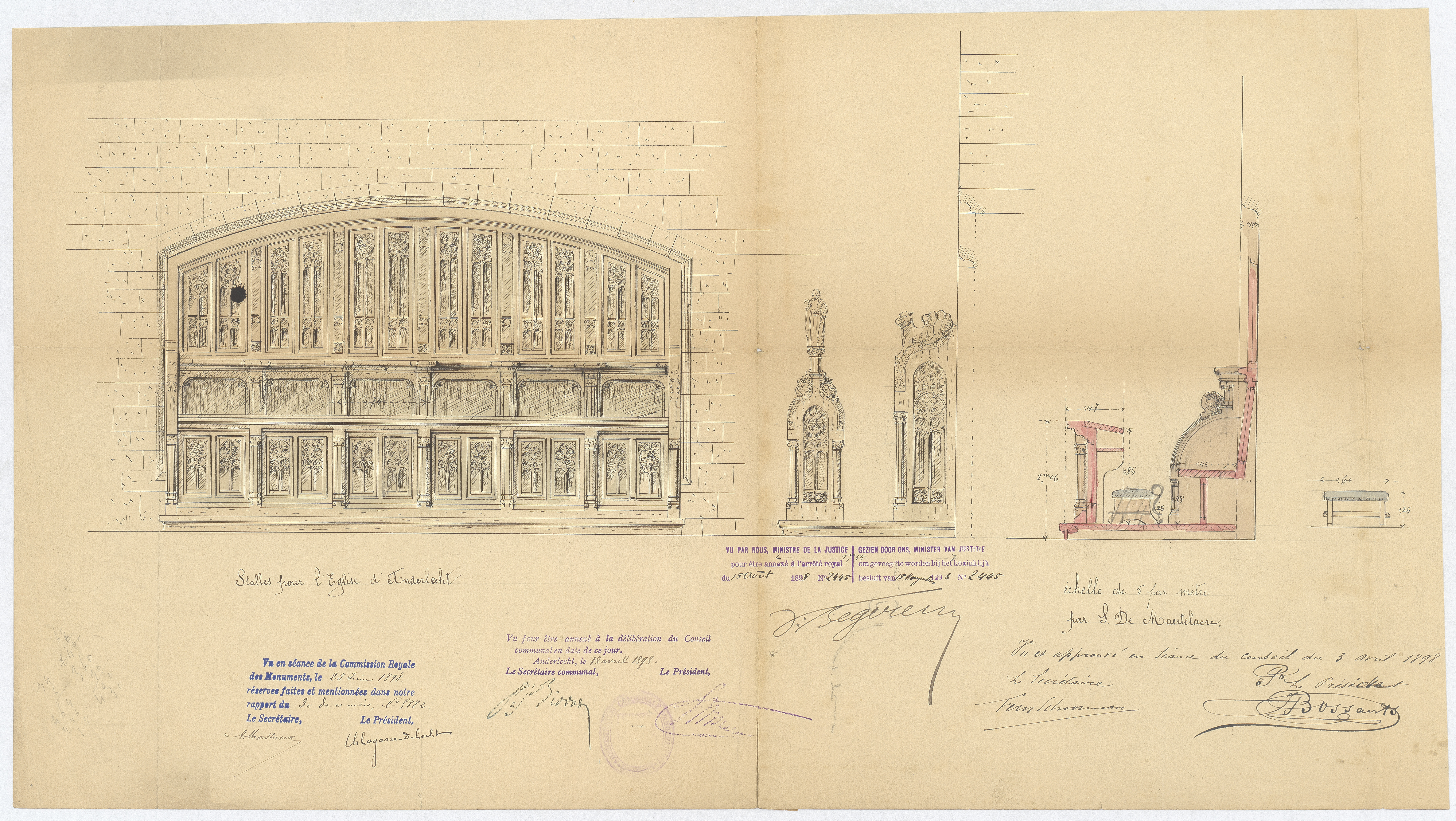 Opschrift: Stalles pour l'Eglise d'Anderlecht. Omschrijving plan: voor- en zijaanzicht en doorsnede gestoelte Datum KCML: 25/06/1898 Archiefnummer: B1602