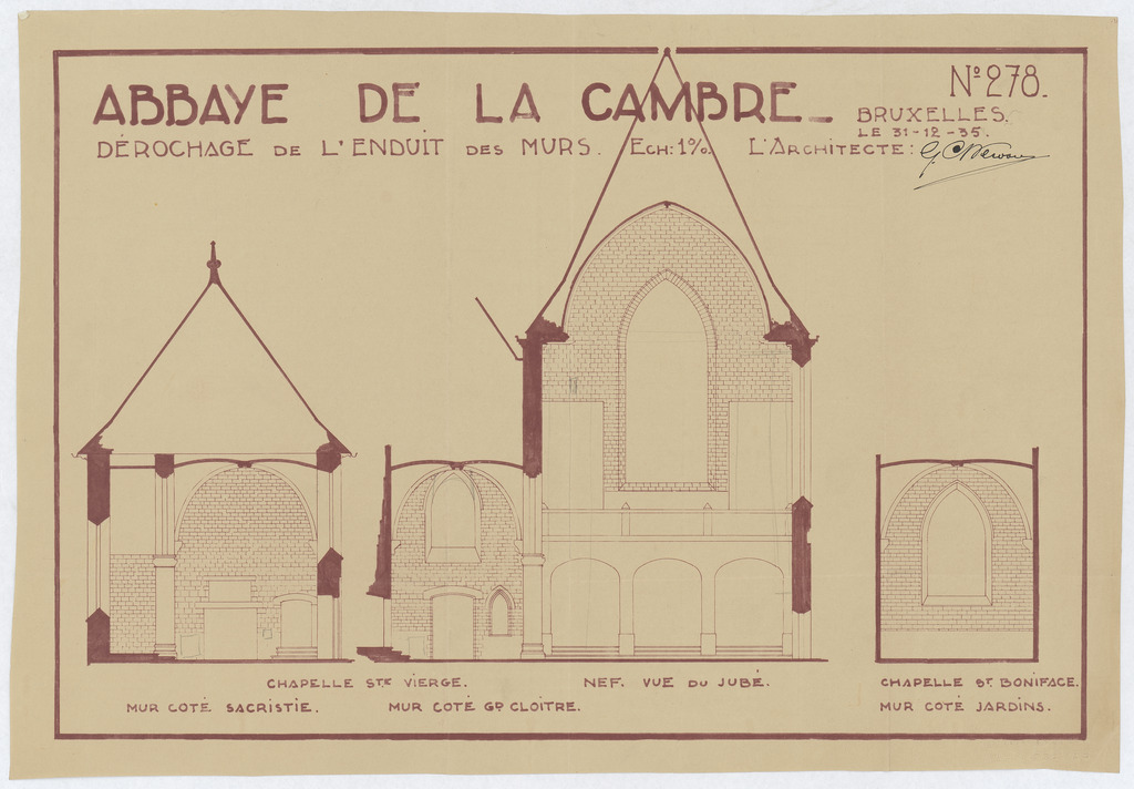 Opschrift: Abbaye de la Cambre. Dérochage de l'enduit des murs. Omschrijving plan: dwarsdoorsneden Datum KCML: deze informatie wordt niet vermeld op het archiefstuk Archiefnummer: B1680