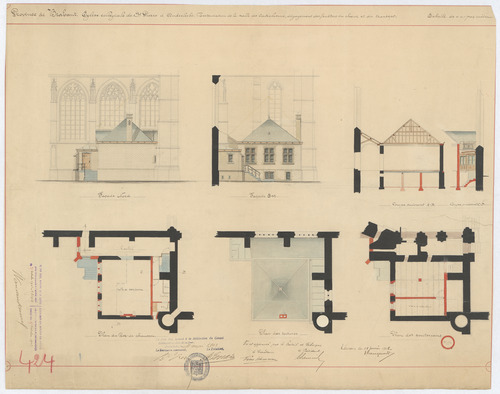 Opschrift: Province de Brabant. Eglise collegiale de St. Pierre à Anderlecht. Restauration de la salle de catéchismus, dégagement des fenêtres du choeur et du transept. Omschrijving plan: plattegrond niveau 0, plattegrond niveau 1, dakenplan, opstand voor- en zijgevel, doorsnede sacristie Datum KCML: deze informatie wordt niet vermeld op het archiefstuk Archiefnummer: B1603