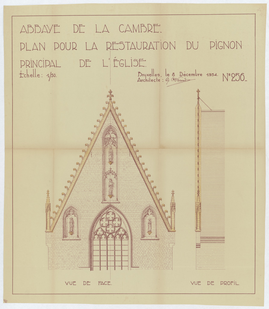 Opschrift: Abbaye de la Cambre. Plan pour la restauration du pignon principal de l'église. Omschrijving plan: opstand voorgevel, zijaanzicht voorgevel Datum KCML: deze informatie wordt niet vermeld op het archiefstuk Archiefnummer: B1674