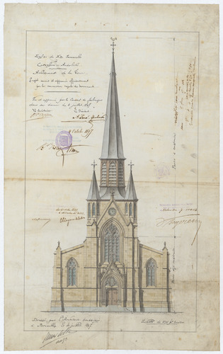 Opschrift: Eglise de N.D. Immaculée à Cureghem - Anderlecht. Achèvement de la tour. Omschrijving plan: opstand voorgevel Datum KCML: 30/10/1897 Archiefnummer: B1607