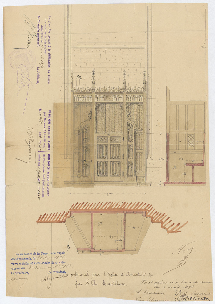 Opschrift: Confessional pour l'Eglise d'Anderlecht. Omschrijving plan: plattegrond, voor- en zijaanzicht biechtstoel Datum KCML: 25/06/1898 Archiefnummer: B1601