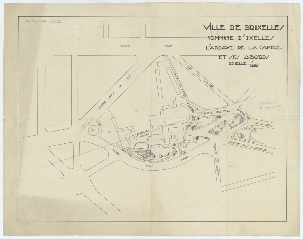 Opschrift: Ville de Bruxelles, commune d'Ixelles. L' Abbaye de la Cambre et ses abords. Omschrijving plan: situatieplan Datum KCML: deze informatie wordt niet vermeld op het archiefstuk Archiefnummer: B1715