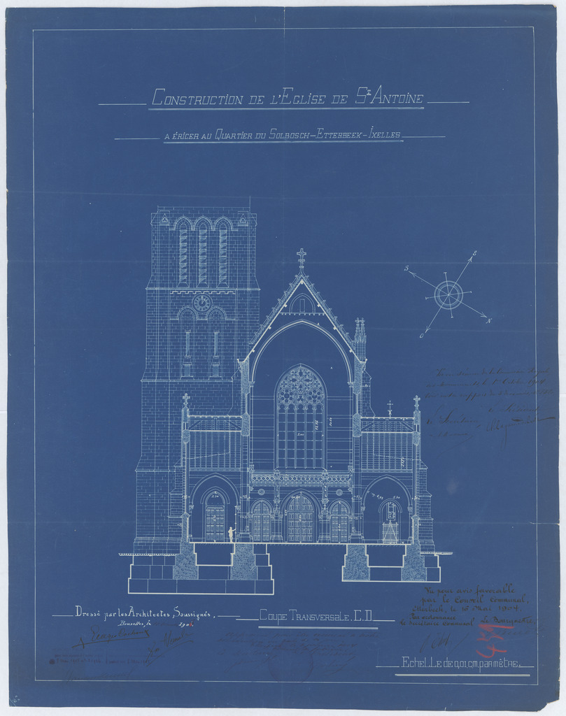 Opschrift: Construction de l'Eglise de St. Antoine a ériger au Quartier du Solbosch-Etterbeek-Ixelles. Coupe transversale E-F. Omschrijving plan: dwarsdoorsnede, dwarsdoorsnede naar portaal Datum KCML: 1 /10/1904 Archiefnummer: B1728