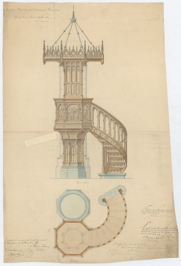 Opschrift: Eglise Paroissiale d'Etterbeek. Projet d'une Chaire de Vérité. Omschrijving plan: plattegrond en aanzicht preekstoel Datum KCML: 21/01/1888 Archiefnummer: B1741_02