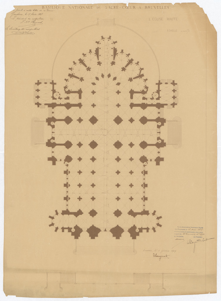 Opschrift: Basilique Nationale du Sacré-Coeur à Bruxelles. Omschrijving plan: plattegrond niveau 0 Datum KCML: 18/05/1907 Archiefnummer: B1782