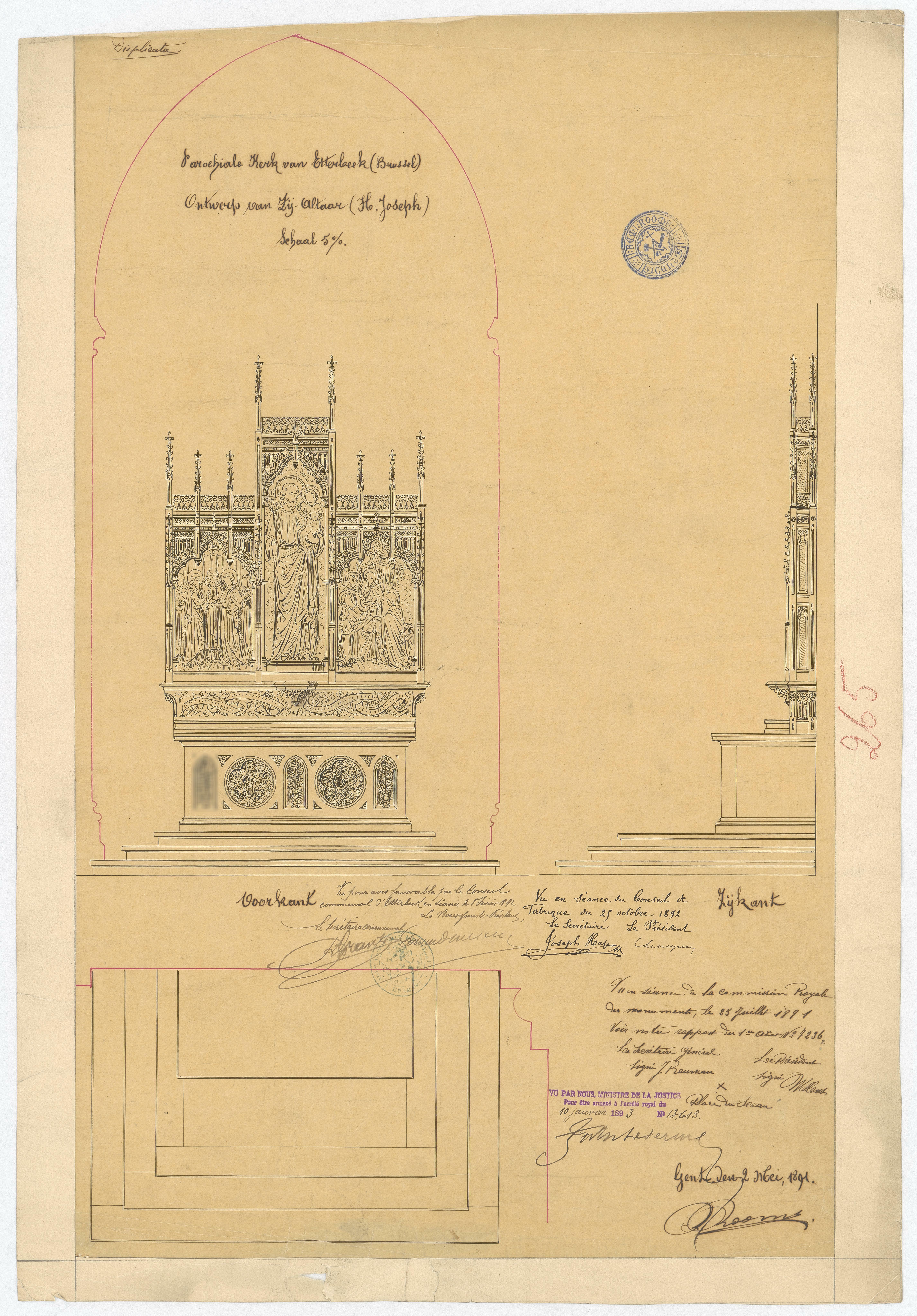 Opschrift: Parochiale kerk van Etterbeek (Brussel) - Ontwerp van Zij-altaar (H. Joseph). Omschrijving plan: plattegrond, voor- en zijaanzicht altaar Datum KCML: 25/07/1891 Archiefnummer: B1752
