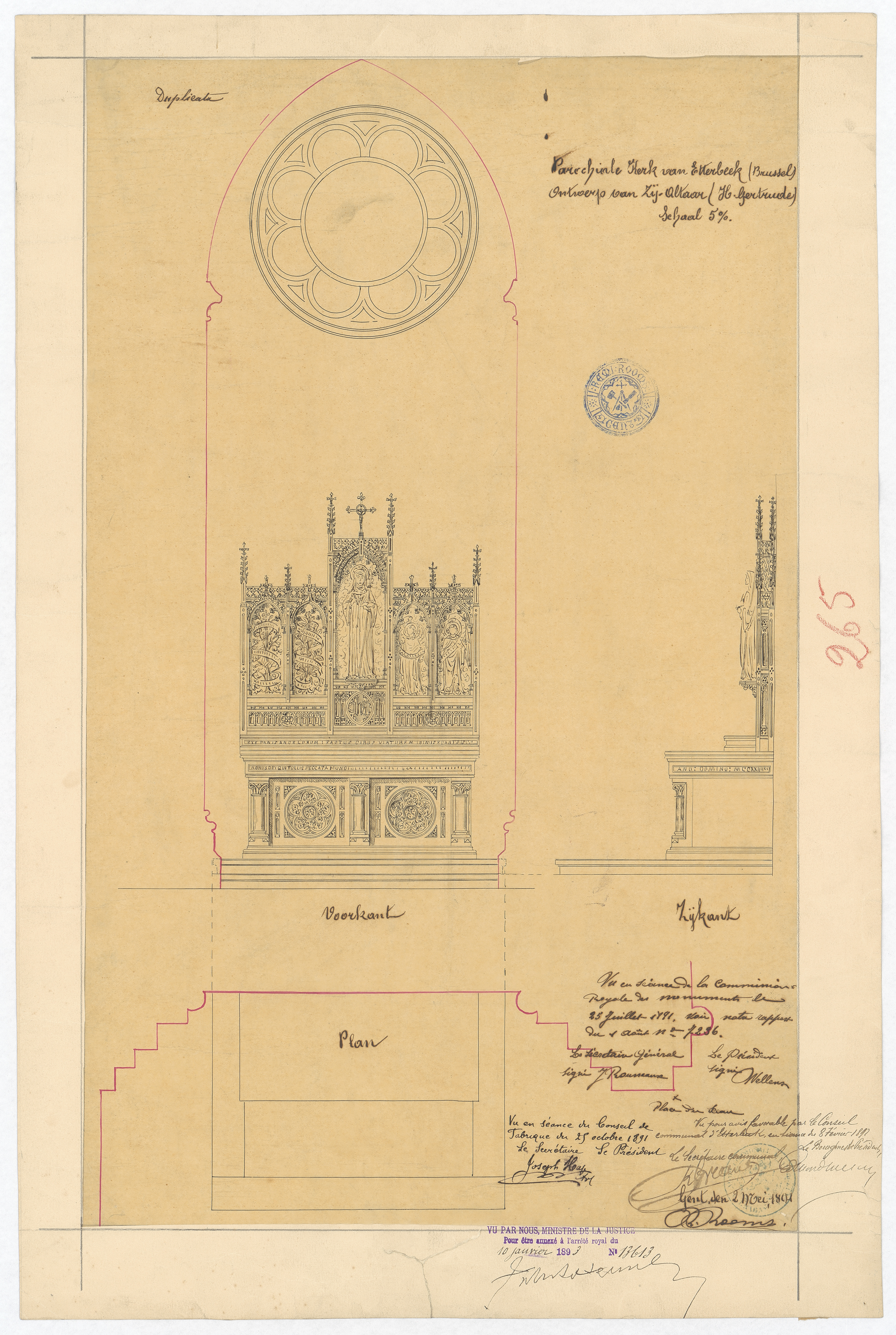 Opschrift: Parochiale kerk van Etterbeek (Brussel) - Ontwerp van Zij-altaar (H. Gertrudis). Omschrijving plan: plattegrond, voor- en zijaanzicht altaar Datum KCML: 25/07/1891 Archiefnummer: B1749