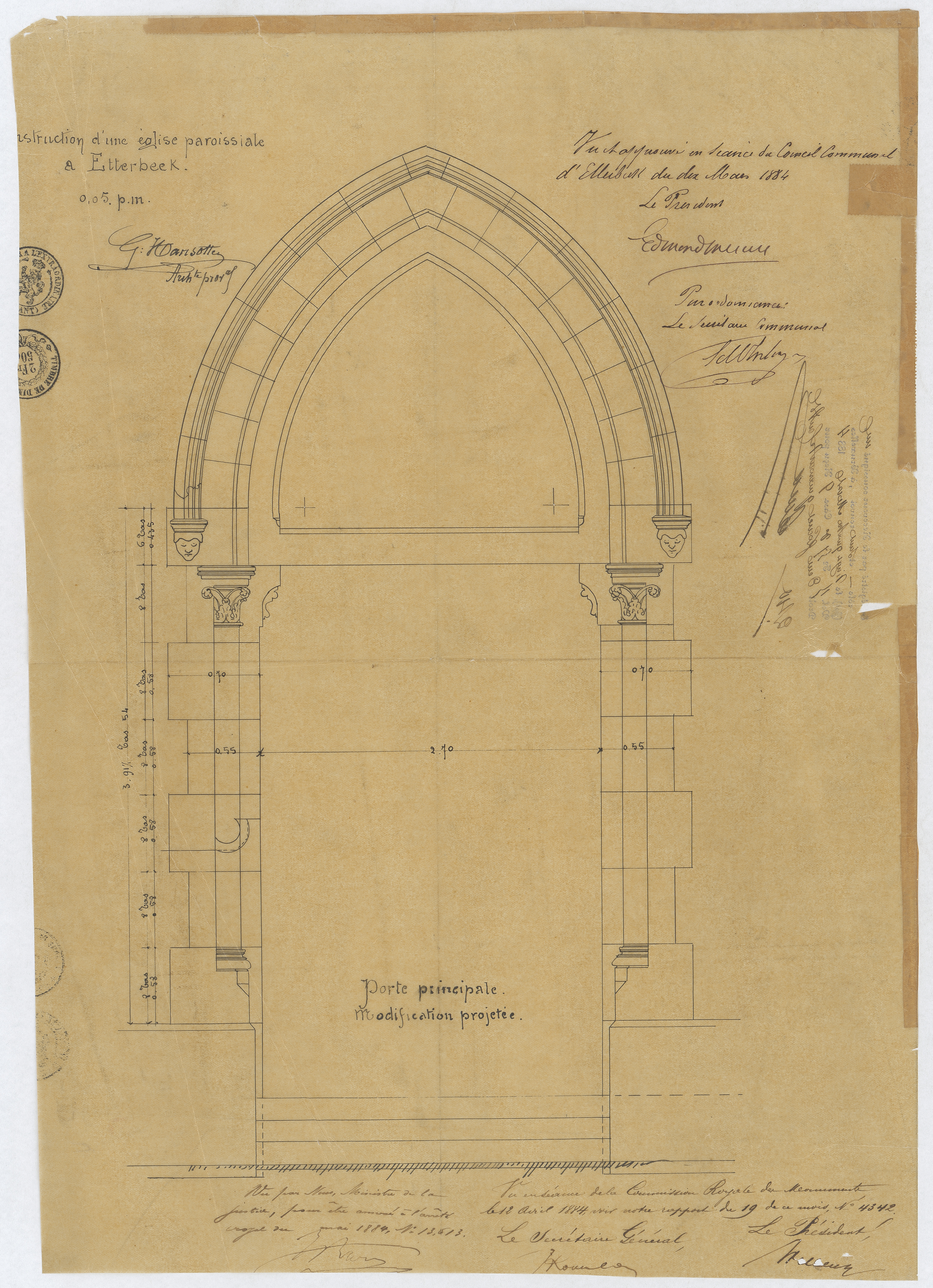 Opschrift: [...]struction d'une église paroissiale à Etterbeek. Omschrijving plan: aanzicht ingang Datum KCML: 12/04/1884 Archiefnummer: B1736