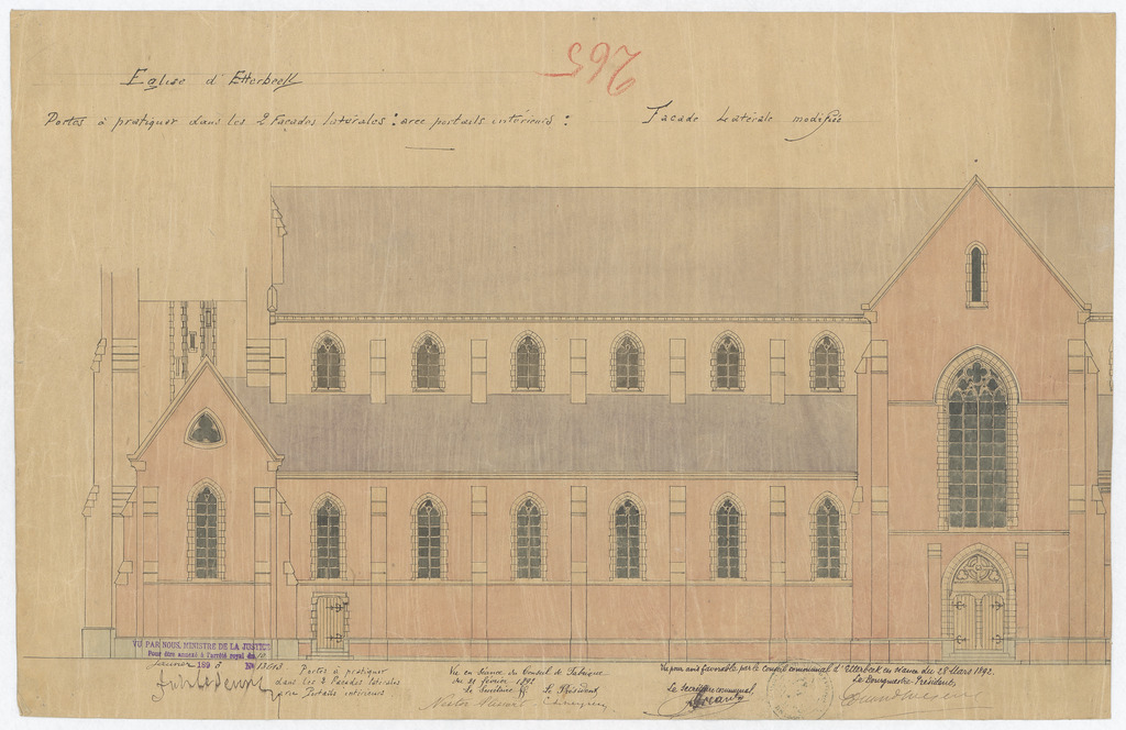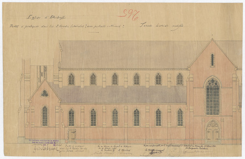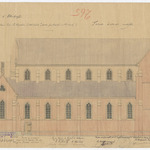 Opschrift: Eglise d'Etterbeek. Portes à pratiquer dans les 2 façades latérales avec portails intérieurs: Façade latérale modifiée. Omschrijving plan: opstand zijgevel 1 Datum KCML: deze informatie wordt niet vermeld op het archiefstuk Archiefnummer: B1760