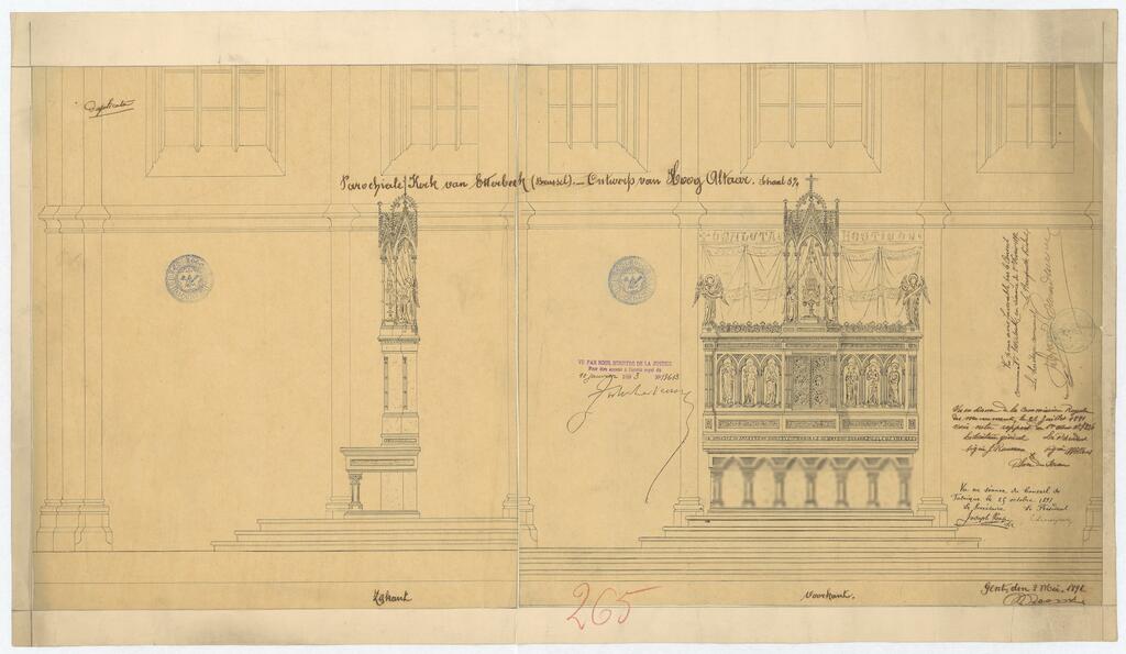 Opschrift: Parochiale kerk van Etterbeek (Brussel) - Ontwerp van Hoog Altaar. Omschrijving plan: voor- en zijaanzicht hoofdaltaar Datum KCML: 25/07/1891 Archiefnummer: B1745