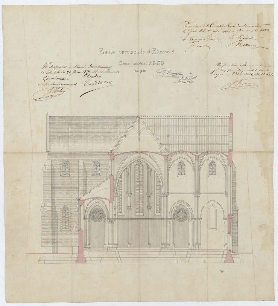 Opschrift: Eglise paroissiale d'Etterbeek. Coupe suivant A.B.C.D. Omschrijving plan: dwarsdoorsnede, dwarsdoorsnede naar koor Datum KCML: 3 /02/1883 Archiefnummer: B1734