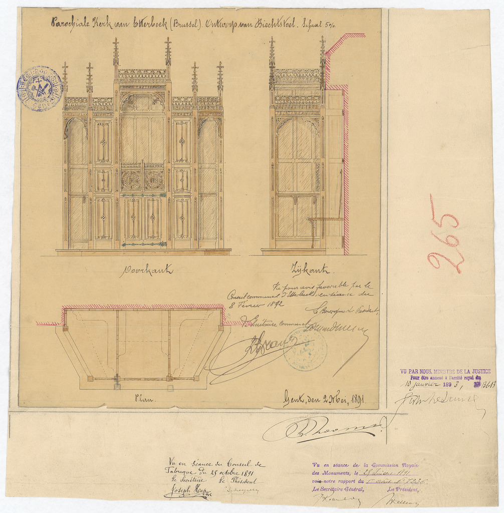 Opschrift: Parochiale kerk van Etterbeek (Brussel) - Ontwerp van Biechtstoel. Omschrijving plan: plattegrond, voor- en zijaanzicht biechtstoel Datum KCML: 25/07/1891 Archiefnummer: B1755